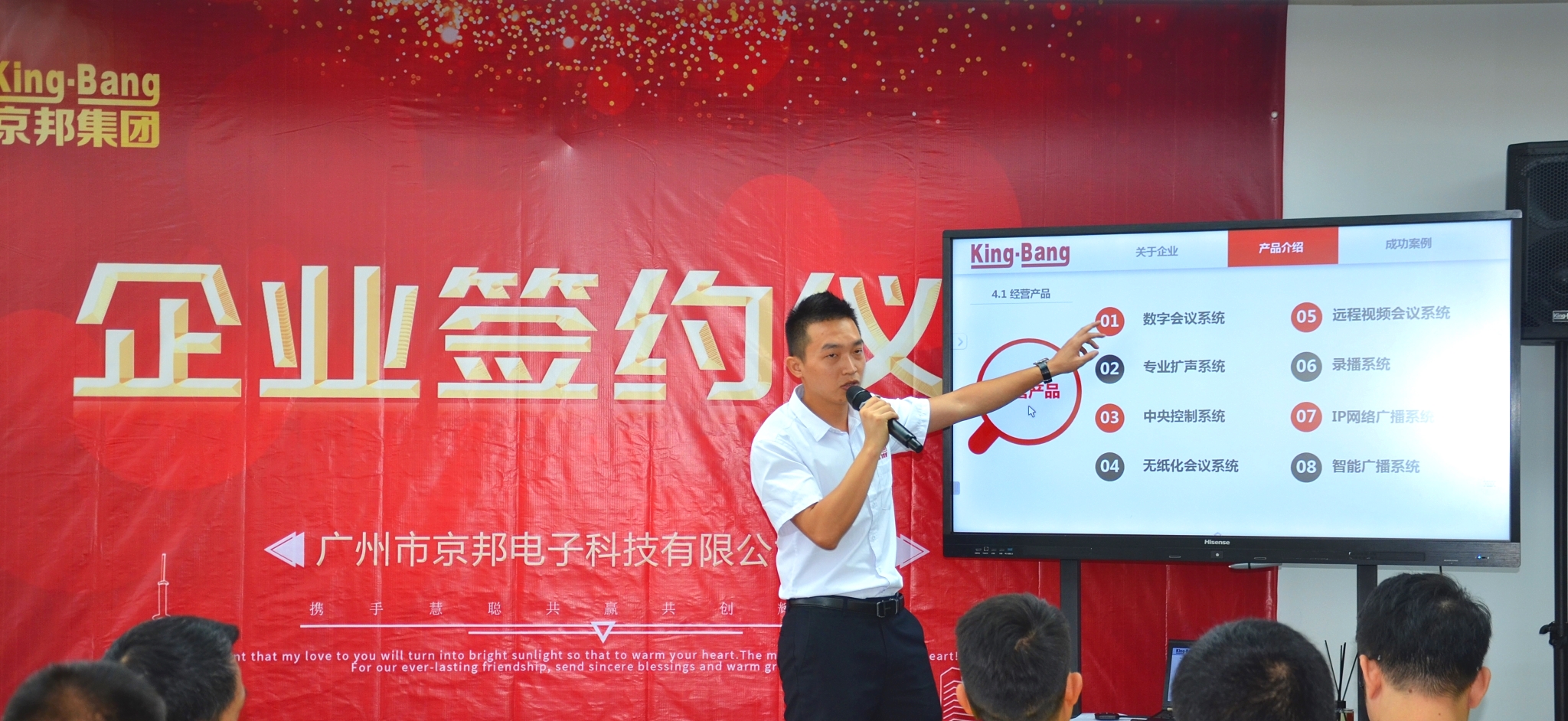 京邦電子(KING-BANG)本次活動為慧聰網買家團帶來了全新的會議系統、網絡廣播系統、智能交互式無紙化會議系統、分布式多媒體中控矩陣系統及專業擴聲等多個系統應用,以“為客戶創造價值,為客戶解決問題,至誠服務客戶“出發,為行業帶來領先的音視頻整體解決方案和服務模式。